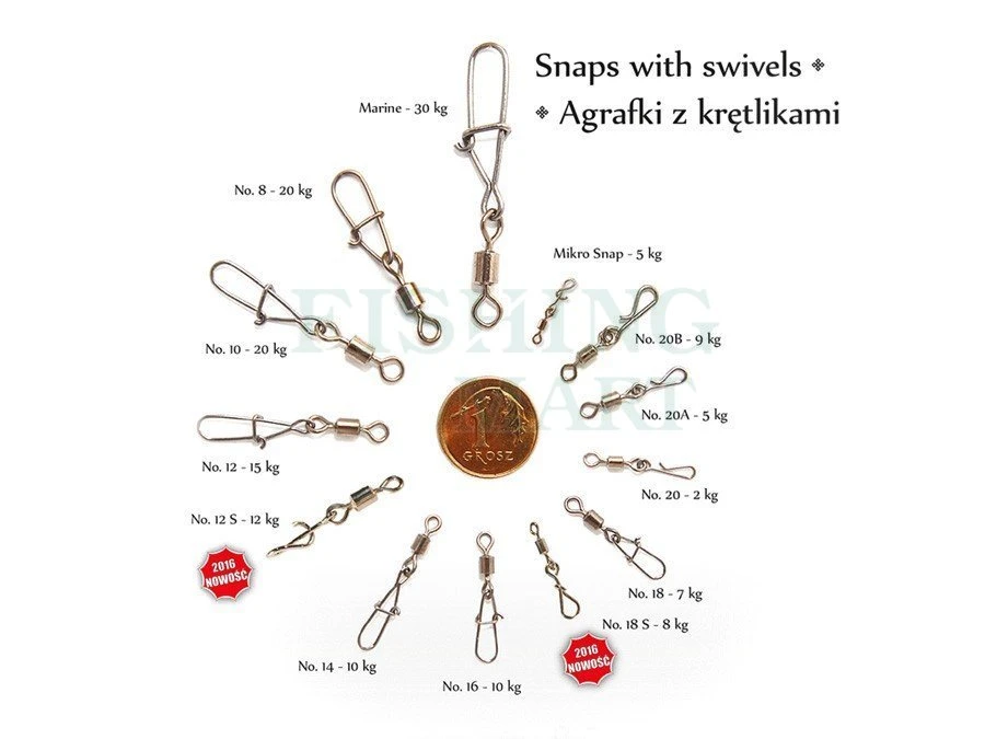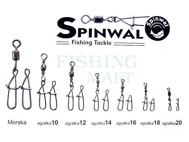 Agrafki z krętlikami firmy Spinwal to najwyższa, światowa jakość. Dostępne wersje od numeru 10 do 18. Zauważyć należy, iż zapinka jest niesamowicie równa i okrągła na całej swojej szerokości. Daje to możliwość montowania wszelkiego typu woblerów bez zbędnych kombinacji.