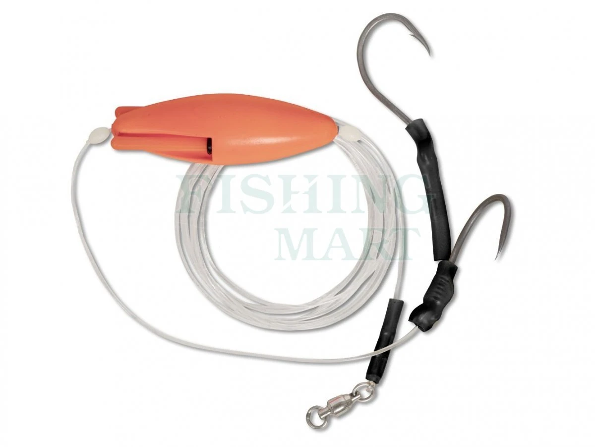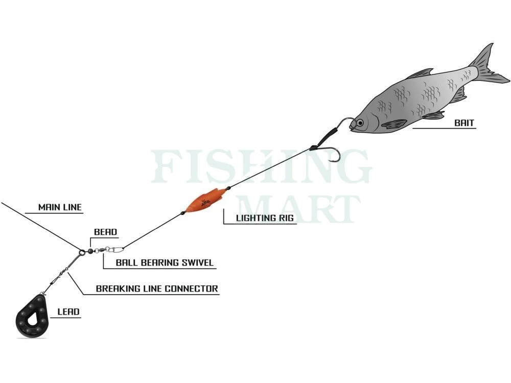 Waller Spezial gotowy przypon od Stefana Seuß. Zestaw Lightning Rig idealnie służy do prezentacji rybki i innych naturalnych przynęt (robaki, kałamarnica) nad dnem. Pływak Lightning U-Float może być wyposażony w świetliki skierowane tyłem do przynęty. Takie źródło światła bezpośrednio powyżej przynęty dodatkowo wabi sumy. Przynęta mocowana jest do zestawu włosowego zbudowanego z dwóch pojedynczych haków.