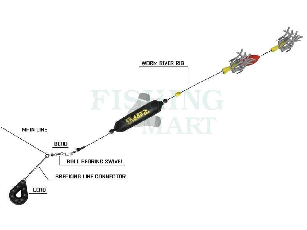Waller Spezial gotowy przypon od Stefana Seuß. Zestaw Worm River Rig to prawdziwy wzorzec, jeśli chodzi o prezentację naturalnych przynęt nad dnem w płynącej wodzie. Bezpośrednio nad przynętą znajduje się przelotowy pływak Winged U-Float, który obraca się w nurcie i wytwarza bardzo wabiące zaburzenia wody ponad przynętą. Przynęta mocowana jest do dwóch pojedynczych haków ustawionych jeden za drugim. Aby ograniczyć wagę przynęty i zapewnić jej pływalność, nawet jeśli jest to duży pęczek dżdżownic na haczyku, pomiędzy kotwicami znajduje się dodatkowy mały element unoszący.