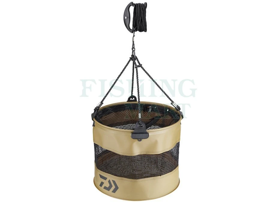 Składane wiadro na żywca DAIWA wykonane z materiału EVA przekonuje wykończeniem i jakością w każdym detalu. Wewnętrzny siatkowy wkład można swobodnie wyciągnąć i przełożyć do wody. W ten sposób żywa przynęta będzie cały czas w świeżej wodzie. Po wyciągnięciu wkładu z wiadra, woda nie wypływa z niego całkowicie, utrzymuje się na poziomie dolnego rantu pozbawionego siatki. Na ścianie wiadra znajduje się nieduża kieszeń na pompę napowietrzającą. Wiadro całkowicie składane, bardzo wygodne do transportowania.