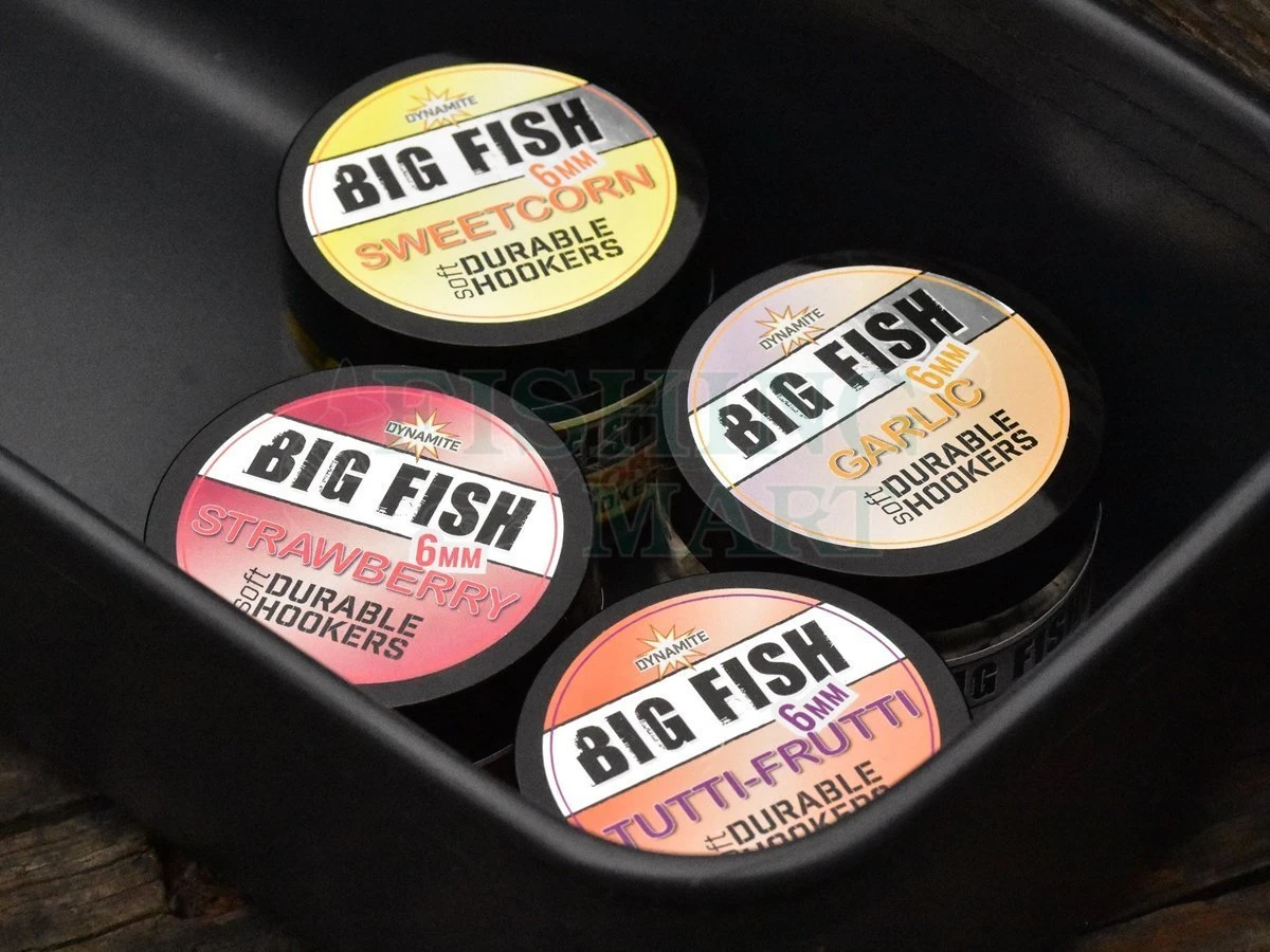 Pellety haczykowe Big Fish Durable Hookers są dostępne w czterech nowych smakach Garlic, Sweetcorn, Strawberry & Tutti-Frutti. Polecane na wszystkie ryby karpiowate. Wykorzystują unikalny innowacyjny proces produkcji. Zawierają rozpuszczalne w wodzie atraktory spożywcze. Są miękkie i wystarczająco trwałe, aby używać bezpośrednio na haczyku lub włosie.