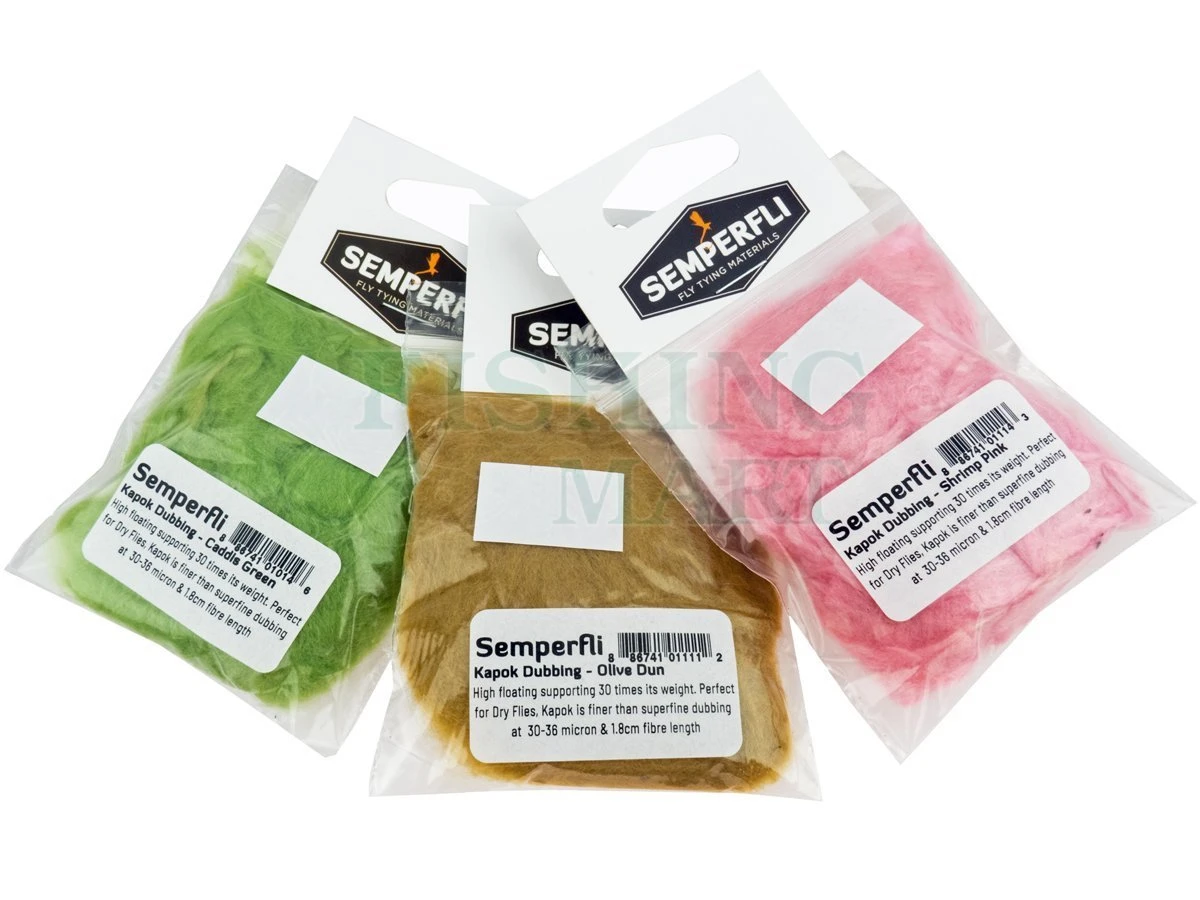 Tradycyjnie kapok jest bardzo trudny do barwienia, jednak zespół Semperfli opracował technologie barwienia, które umożliwiły masowe farbowanie kapok dubbing za każdym razem powtarzalnymi kolorami.