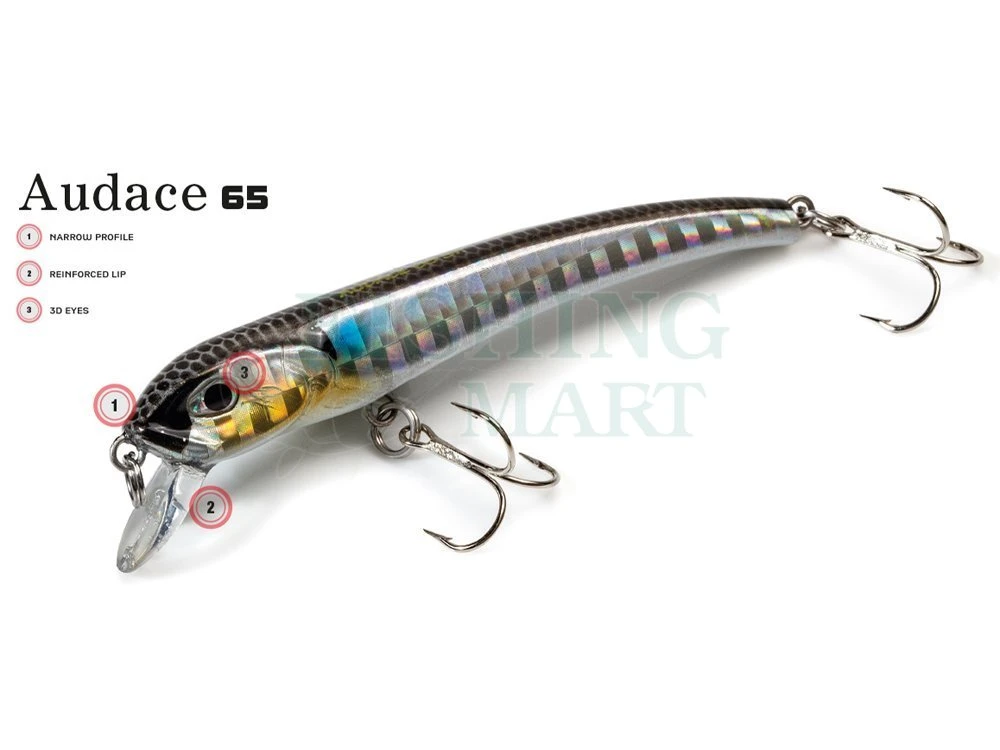 Przynęty Molix Audace 65 Suspending – To jerkbaity o długości 6,5 cm i wadze 4 g, sprawdzające się zarówno w słonej, jak i w słodkiej wodzie. W rwących i szybkich rzekach sprawdzi się do połowu pstrągów, a w słonej wodzie do trollingu. Rozmiar i waga przynęty nie wpływają na rzut. Model „powolnie tonący” pokazuje swoją charakterystyczną prace podczas łowienia z powtarzającymi się zatrzymaniami i ruchami wędki. Skuteczny również na klenie, okonie i czarne bassy.
