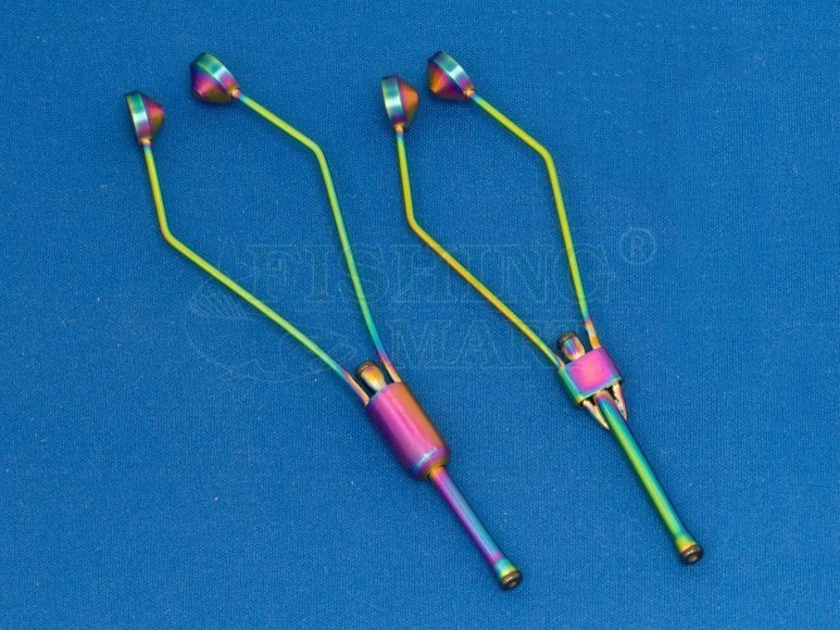 Dwa modele nawijarek Veniard z najnowszej serii pokrytej tytanem w atrakcyjnym wykończeniu w tęczowym kolorze.