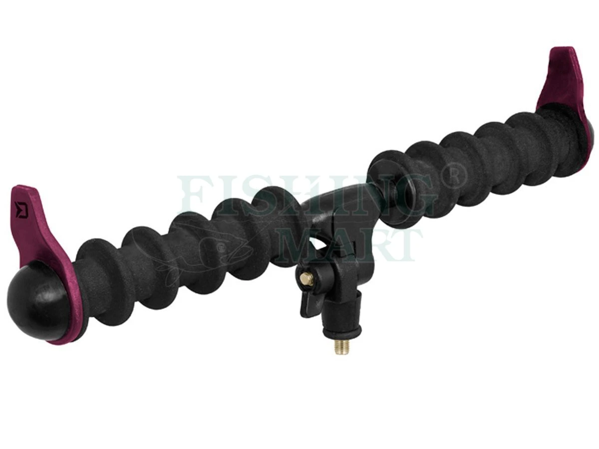 Delphin EVASTIC SetUp to uchwyt na wędkę o szerokości 25 cm. Jest to praktyczny element przeznaczone do łowienia feederem. Wykonany z czarnej pianki EVA, która jest bardzo lekka i miękka, chroniąca blank wędki. Nieregularny kształt tego uchwytu utrzymuje wędkę idealnie na swoim miejscu. Znajdziesz stopery boczne wędki, wykonane z czerwonego plastiku bordeaux, zapobiegające spadnięciu wędki na ziemię podczas nagłego uderzenia. Uchwyt na wędkę jest wyposażony w uniwersalny gwint, a także w przegub, w którym można ustawić kąt w zależności od miejsca łowienia.