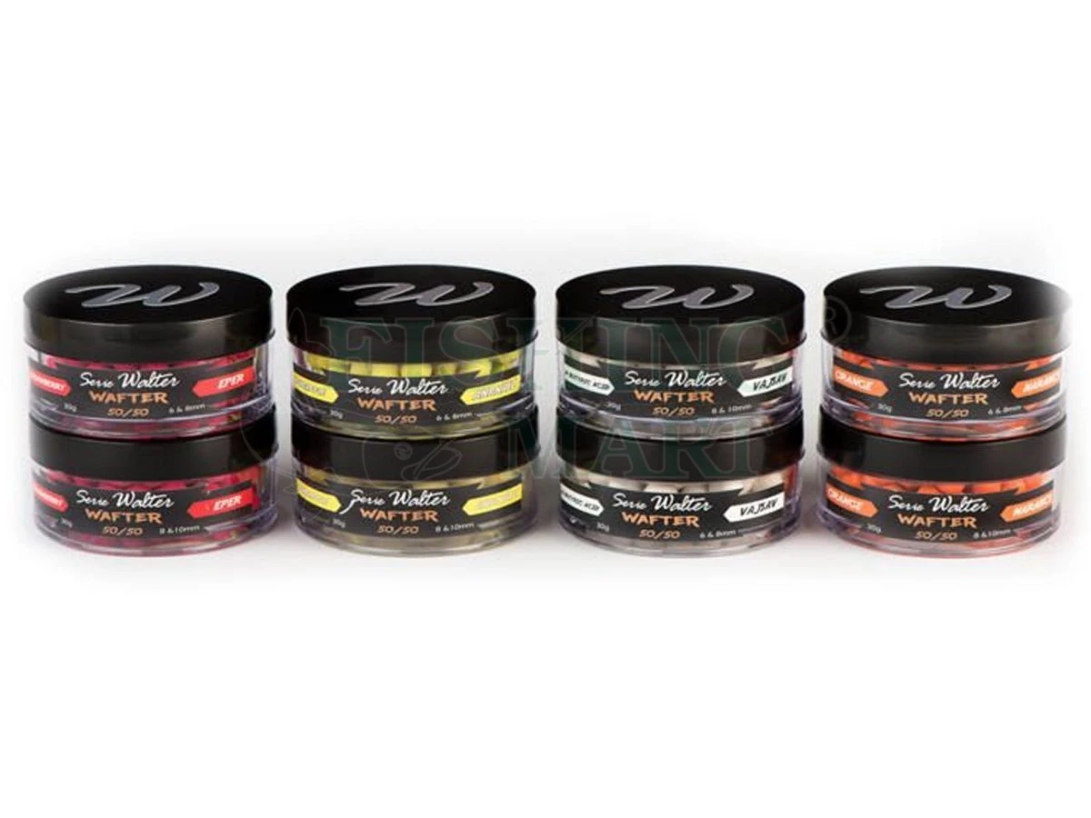 Jedna z najnowocześniejszych przynęt karpiowych, waftersy są lżejsze od wody i doskonale równoważą się na dnie. Wafters założony na przypon włosowy, unosi się na dnie i nie podnosi nawet najmniejszego haczyka. Dostępne w siedmiu smakach, pakowane w specjalne słoiczki dwukomorowe w kombinacjach 6-8 mm i 8-10 mm.