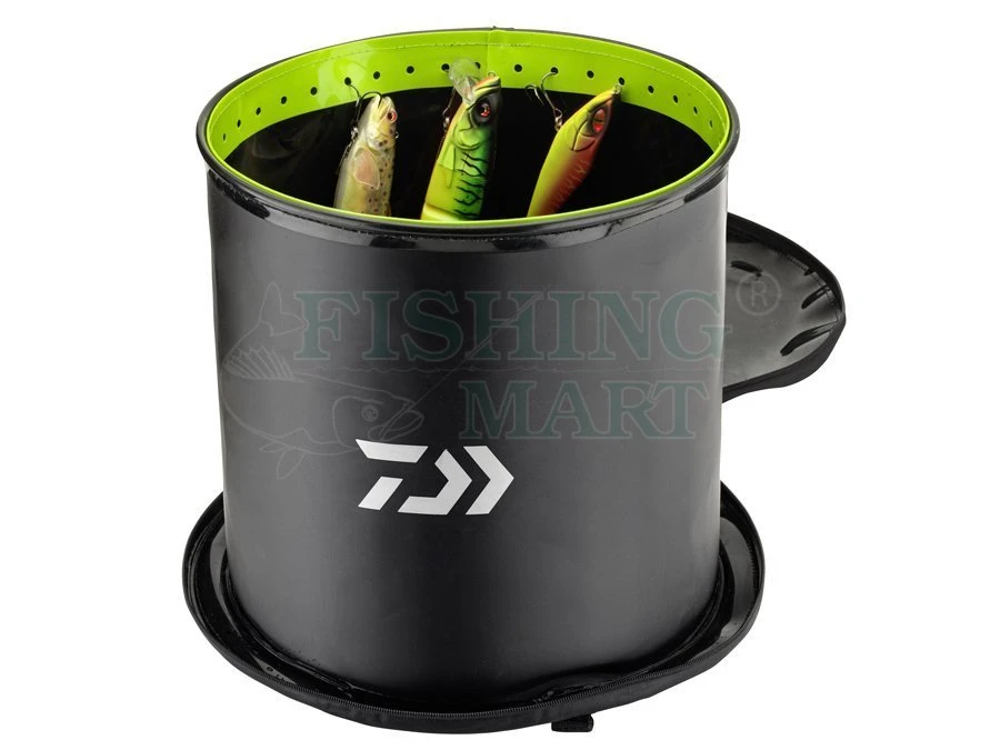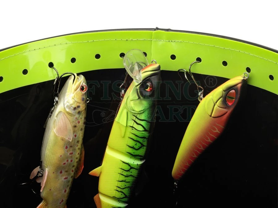 Dodatkowo możemy w ten sposób szybko sięgnąć ponownie po odłożony wabik. Wszelkiego typu przynęty mogą być zawieszane na dziurkach w szynie na górnym rancie wiadra XL – wisząc w ten sposób schną powoli zamiast walać się po dnie łodzie. Jest to również bardzo przejrzysty sposób przechowywania, zapewniający doskonałą dostępność często używanych wabików. Wiadro XL pomieści do 24 dużych przynęt do 30cm długości. Ekstra mocny materiał EVA wytrzymuje obciążenie ok.1,80kg bez zaginania się. Jeśli wiadro nie jest już potrzebne, można je bardzo łatwo złożyć na płasko dla wygodniejszego transportu.
